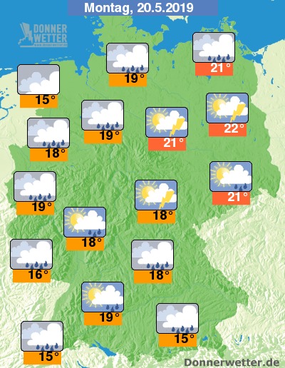 Zum Wochenstart zeigt sich das Wetter meist von seiner wechselhaften Seite, denn bei meist starker, und nur gelegentlich aufgelockerter Bewölkung bilden sich im Tagesverlauf verbreitet Schauer und besonders über der Südosthälfte, aber teils auch im Norden und Westen einzelne Gewitter. Trocken bleibt es voraussichtlich nur im Nordseeumfeld. Die Temperatur erreicht 15 Grad in München und bis 22 Grad in Berlin.