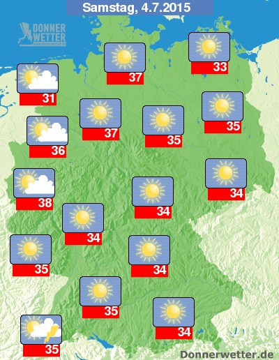 Regional kann auch die 35-Grad-Marke überschritten werden. Besonders für den Samstag sieht es nach meist sonnigem Wetter aus, während am Sonntag von Westen und Südwesten zum Teil kräftige Quellwolken aufziehen können, die ein gewisses Unwetterpotential darstellen.