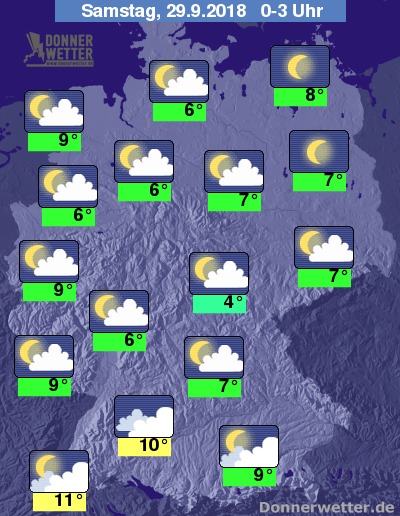 In der Nacht zeigt sich der Himmel meist locker oder aufgelockert bewölkt, entlang der Oder sowie später auch im Süden Baden-Württembergs kann es im Nachtverlauf auch aufklaren. Schauer sind nicht zu erwarten.