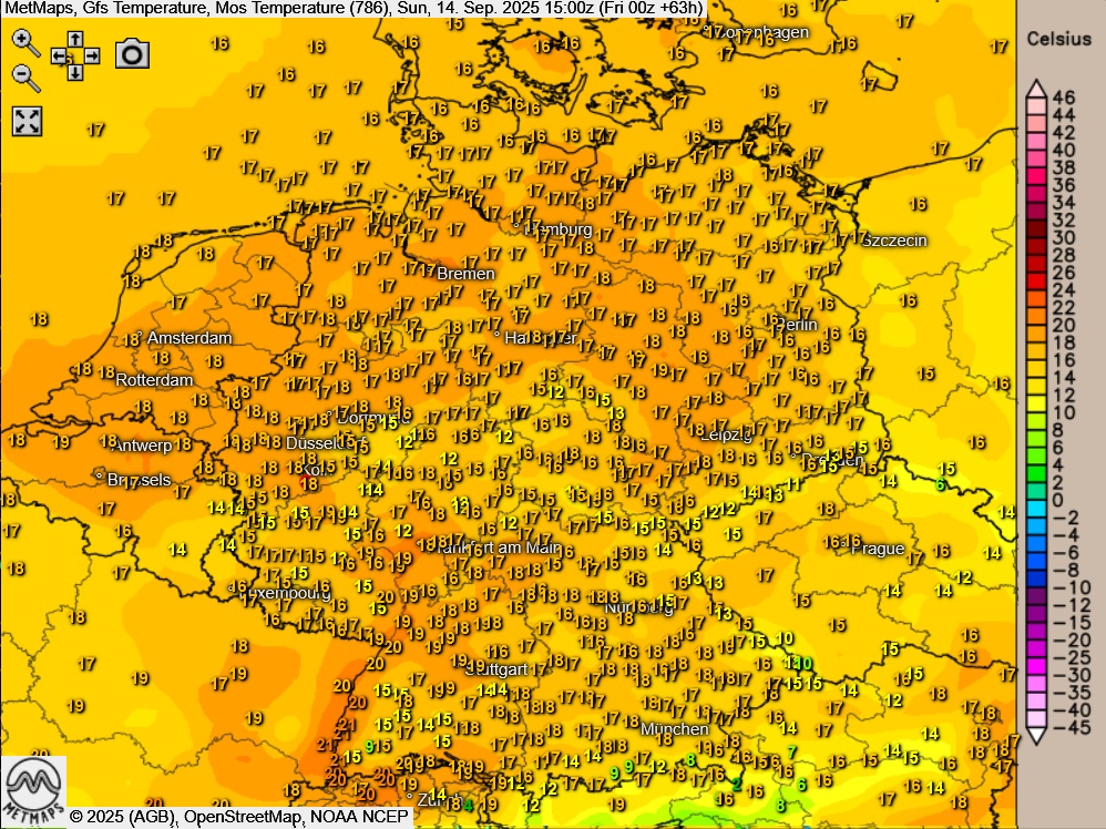 Die Wetterkarte für Sonntagabend (18:00 Uhr) sowie die Lufttemperaturen am Sonntagnachmittag (15:00 Uhr) nach GFS: