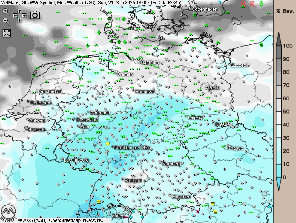 Am Sonntagnachmittag zeigt sich der Himmel verbreitet heiter bis wolkig. Im Nachmittagsverlauf nimmt die Bewölkung im Westen und Nordwesten zu, es bleibt aber meist niederschlagsfrei.