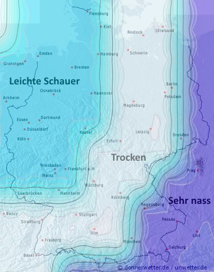 Wo am Samstag die Chancen auf ein trockenes Fußfallfest am besten stehen, zeigt unsere folgende Karte (Regenverteilung Deutschland, Samstag zwischen 14:00 und 22:00 Uhr):