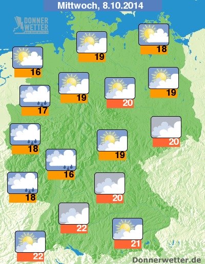 Am Mittwoch zieht zumeist viele, häufig dichte Wolken durch. Besonders am Vormittag sind aber mit Ausnahme des Westens noch einige Wolkenlücken möglich. Von Westen her breitet sich im Tagesverlauf jedoch, zum Teil kräftiger Regen aus. Dabei bleibt es voraussichtlich nur im Süden und im äußeren Osten bis zum Abend hin trocken. Im Westen und Nordwesten des Landes weht ein teils stürmischer Wind, dabei sind einzelne Sturmböen möglich. Die Temperatur steigt auf 16 Grad im Nordseeumfeld und bis 22 Grad am Bodensee.