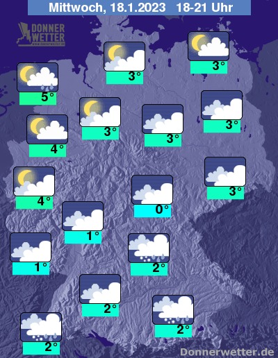 Heute Abend ist es im Norden und Westen meist locker bis aufgelockert bewölkt und trocken. Im Emsland zieht jedoch neuer Regen oder Schneeregen auf. Im übrigen Land ist es verbreitet stark bewölkt oder bedeckt und im Süden fällt gebietsweise Schnee oder Schneeregen, sonst bleibt es trocken. Die Temperatur liegt bei 0 Grad in Jena und 5 Grad in Bremerhaven.