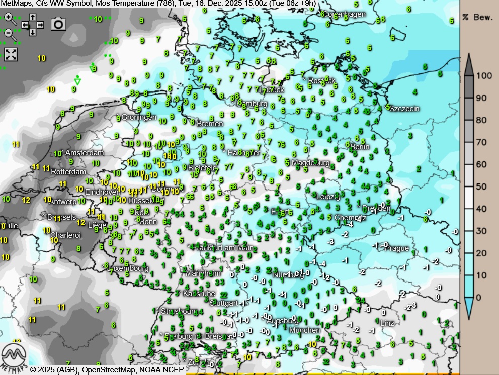 Im Dauergrau erreichen die Temperaturen heute Werte um 1 Grad, sonst Höchstwerte um 4 bis 10 Grad.