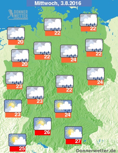Am Mittwoch kann sich im Süden zwischen den oft lockeren Wolken häufiger die Sonne zeigen, dazu bleibt es südlich der Donau auch weitgehend trocken. Weiter nach Norden hin bleibt die Wolkendecke dagegen verbreitet geschlossen und es fällt zeitweise Regen. Im Norden bilden sich zeitweise Schauer, an Nord- und Ostsee auch stellenweise Gewitter. Die Temperatur steigt auf 20 Grad am Niederrhein und auf sommerlich warme 27 Grad in München.