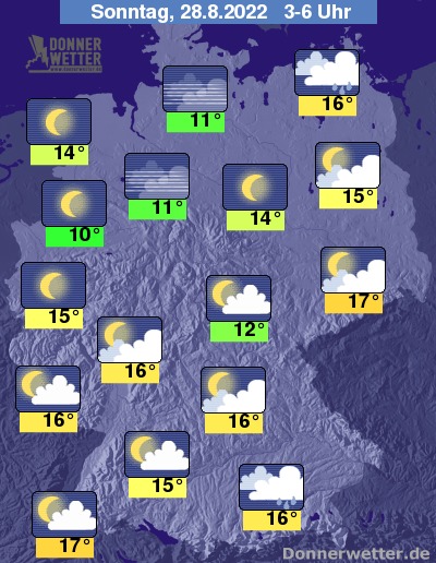 In der folgenden Nacht bilden sich im Südosten des Landes und in Vorpommern noch einzelne Schauer, sonst ist der Himmel vor allem über der Nordwesthälfte Deutschlands meist sternenklar. Im übrigen Land ist es locker bis aufgelockert bewölkt und trocken. Die Temperatur sinkt auf 17 Grad in Freiburg und 10 Grad in Meppen.