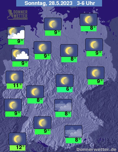 In der folgenden Nacht zeigt sich der Himmel über Deutschland überwiegend sternenklar. Einige Wolkenfelder sind im Verlauf an der Nordsee und im Nordwesten möglich, dazu bleibt es trocken. Die Temperatur sinkt auf 12 Grad am Oberrhein und 6 Grad am Thüringer Wald.