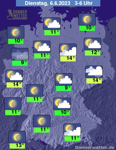 In der bevorstehenden Nacht halten sich über Sachsen und am Bayerischen Wald meist dichte Wolken, dabei fällt gebietsweise Regen. Im übrigen Osten ist auch oft stark bewölkt, jedoch trocken. Im großen Rest der Republik ist es meist sternenklar oder locker bewölkt und dazu trocken. Die Temperatur sinkt auf 14 Grad in Dresden und bis 9 Grad in Emden.