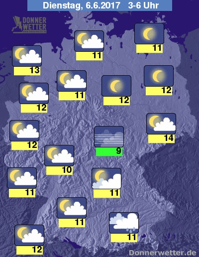 In der bevorstehenden Nacht bleibt es im Südosten meist bedeckt bei letzten Regenfällen, sonst ist es verbreitet nur locker bewölkt und vor allem über der Nordhälfte der Republik auch oft sternenklar, dabei bleibt es trocken. Gegen Morgen verdichten sich die Wolken jedoch im äußeren Westen, dabei ist hier erster Regen möglich. Die Temperatur sinkt auf 14 Grad in der Lausitz und bis 9 Grad im Thüringer Becken.