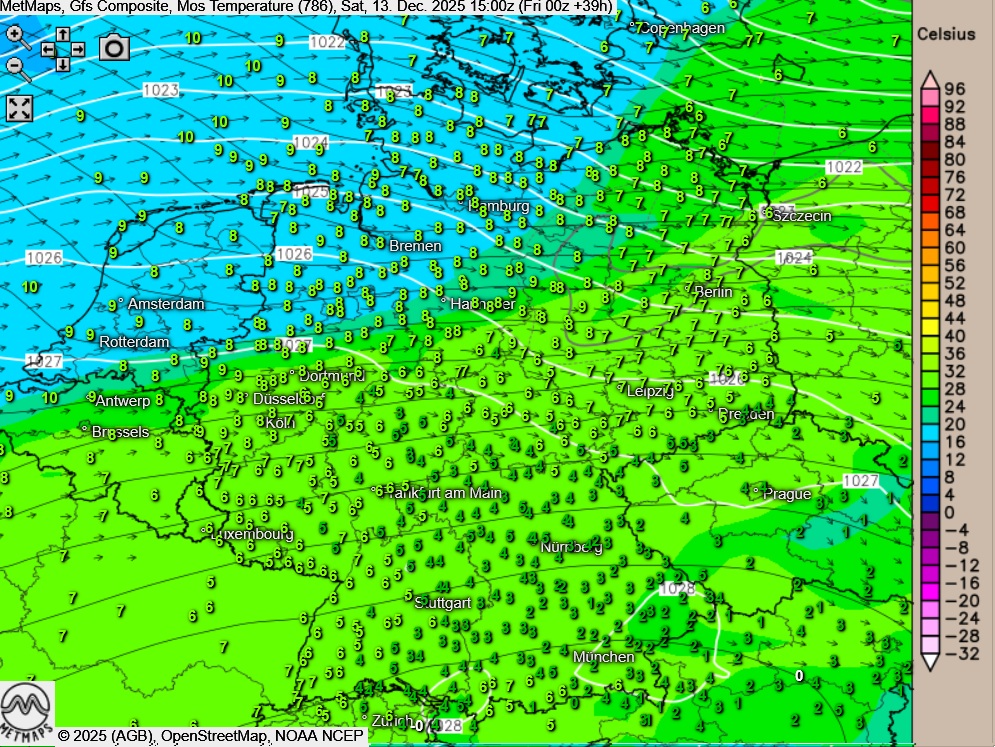 Am Samstagnachmittag bleibt der Himmel über weiten Landesteilen stark bewölkt, meist bleibt es jedoch niederschlagsfrei. Über dem Süden hält sich weiterhin teils zäher Nebel, größere Auflockerungen beschränken sich vor allem auf das Alpenumland sowie die Nordränder der Mittelgebirge.