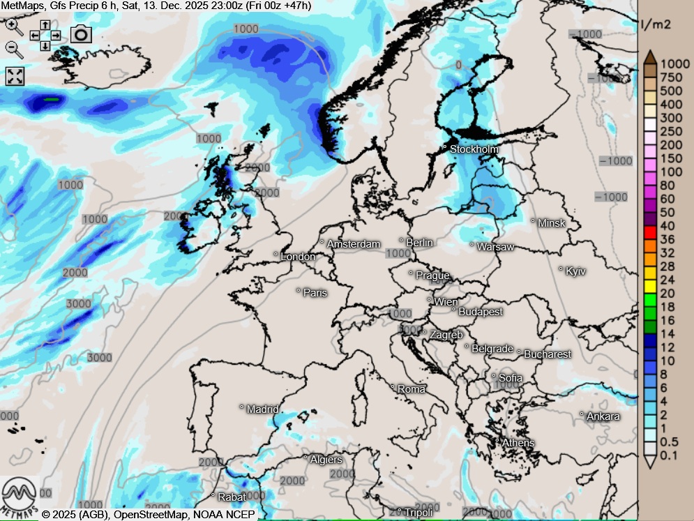 Die Strömungs- / Temperaturkarte für Samstagnachmittag sowie die Sechs-Stunden-Regenmengen für Europa bis 23:00 Uhr nach GFS: