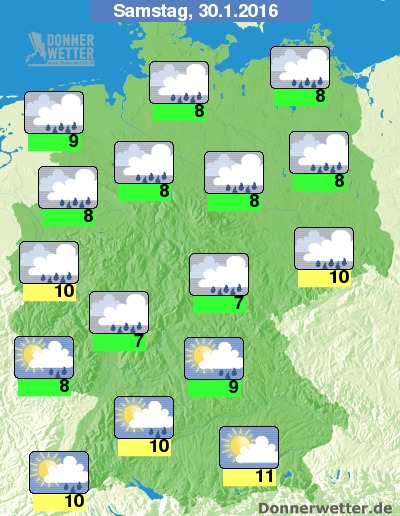 Am Samstag ist es im Süden des Landes anfangs noch oft locker oder aufgelockert bewölkt und dazu trocken. Im übrigen Bundesgebiet zeigt sich der Himmel dagegen bedeckt und zum Teil fällt kräftiger und auch langanhaltender Regen. Die Temperatur steigt auf 7 Grad in Unterfranken und bis 10 Grad im Breisgau. Es weht oft starker, zum Teil auch stürmischer Wind, auf den Bergen und an der See herrscht teils Sturm.