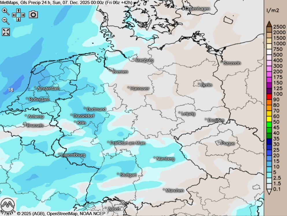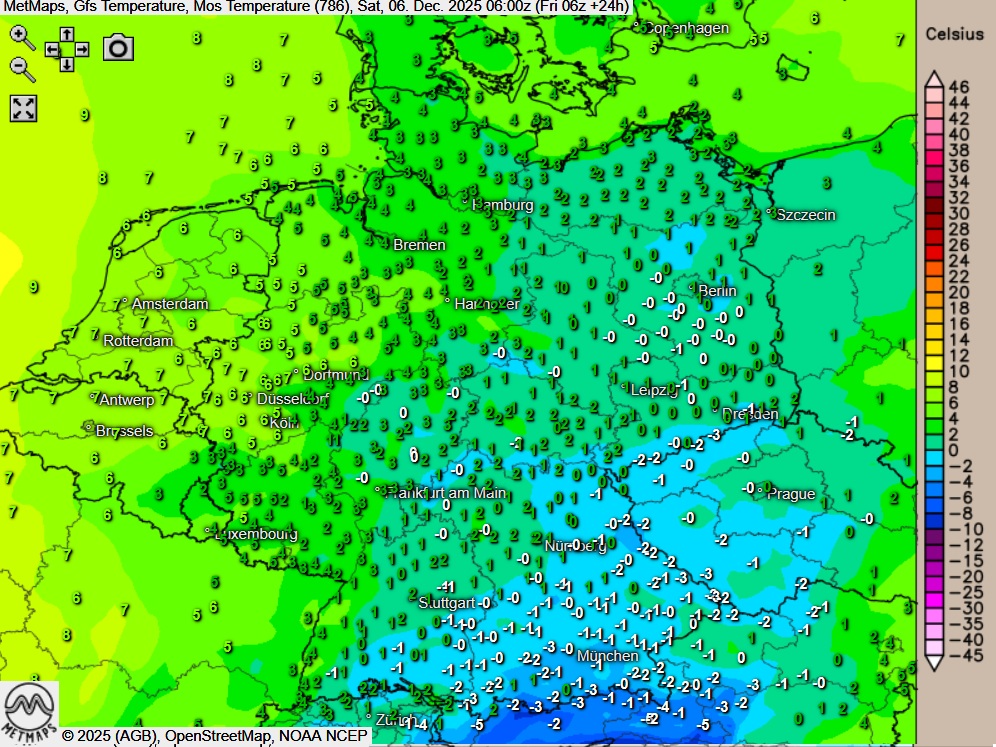 Die Temperaturkarte für den Nikolausmorgen (06:00 Uhr) sowie die 24-Stunden-Regenmengen für Samstag nach GFS: