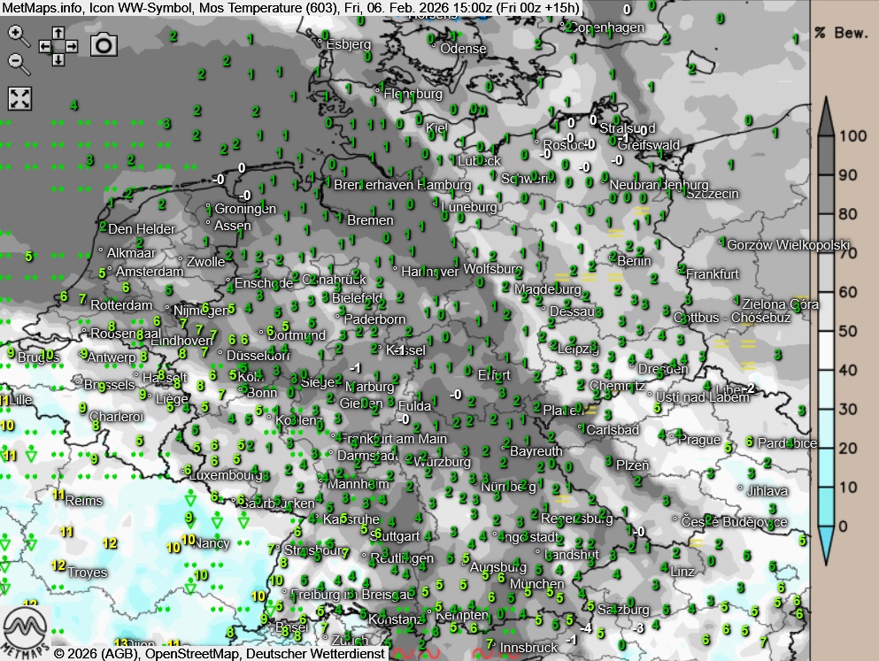 Die Temperaturen erreichen im Nordosten Höchstwerte um -1 und 4 Grad, am Oberrhein lokal bis zu 12 Grad.