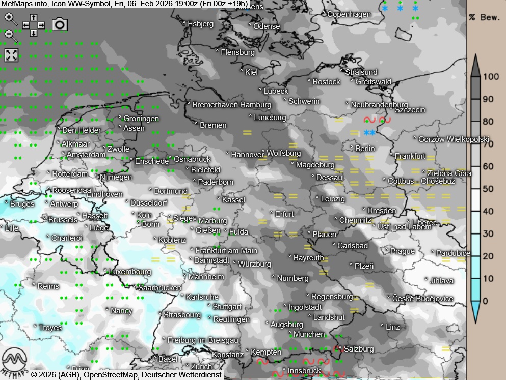 In den übrigen Landesteilen überwiegt dichte Bewölkung oder es ist nebelig-trüb. Am Nordrand der Mittelgebirge sowie an den Alpen kann sich auch mal die Sonne zeigen.