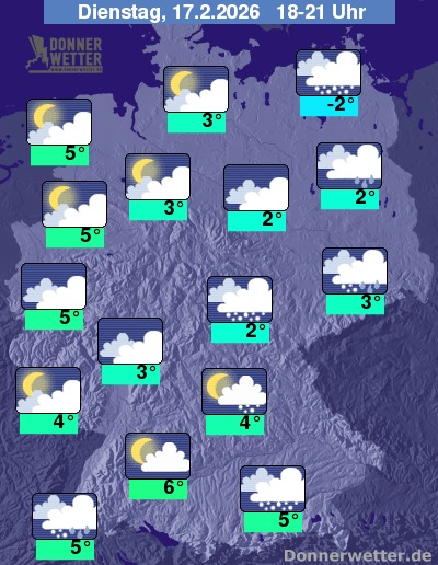 In der Nacht zum Mittwoch zeigt sich der Himmel überwiegend dicht bewölkt, dazu fällt besonders vom Norden und in den Osten und in den Norden Bayerns Schnee, teilweise auch Schneeregen. Im übrigen Bundesgebiet bleibt es meist trocken. Die Tiefstwerte liegen bei 1 Grad in Dresden und bis -5 Grad in Neubrandenburg.