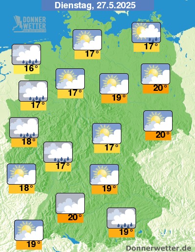 Am Dienstag zeigt sich der Himmel über dem Westen und Nordwesten dicht bewölkt oder bedeckt; hier, sowie später auch im Nordosten, fällt dabei zeitweise Regen, der später in Schauer übergeht. In den übrigen Landesteilen ist es am Dienstag wechselnd oder stark bewölkt und es bleibt meist trocken.