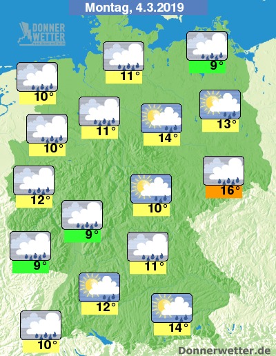 Heute ziehen verbreitet dichte Wolken durch und es fällt wiederholt Regen, zudem sind örtlich auch kräftige und teils gewittrige Schauer möglich, hier und da zeigen sich jedoch auch Auflockerungen. Die Temperatur steigt auf 9 Grad an der Ostsee und bis 16 Grad in Dresden. Es weht meist frischer bis starker, über der Nordhälfte vielerorts stürmischer und auf den Bergen und an der See auch orkanartiger Wind.