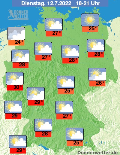 Heute Abend zieht es sich im Nordwesten oft zu, auch im Westen ist es teils stark, teils auch aufgelockert bewölkt. Im übrigen Bundesgebiet ist es hingegen meist heiter bis sonnig. Es bleibt landesweit trocken bei 24 Grad in Cuxhaven und bis 30 Grad in Köln.