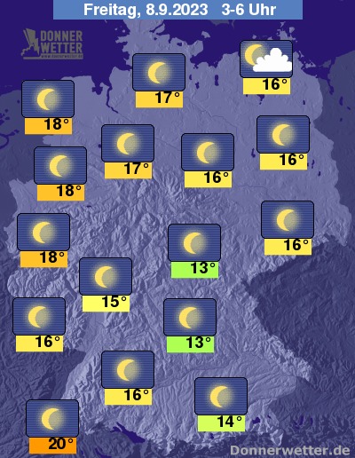 In der folgenden Nacht zeigt sich der Himmel über dem Land sternenklar, dazu bleibt es trocken. Die Temperatur sinkt auf tropische 20 Grad in Freiburg und etwa 13 Grad in Jena.