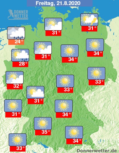Die Höchsttemperaturen liegen vom Münsterland bis zur Nordsee zwischen 24 und 29 Grad, sonst werden verbreitet schweißtreibende Werte zwischen 30 und 36 Grad erreicht.