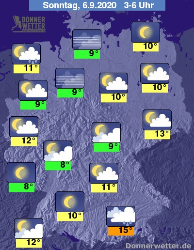 In der kommenden Nacht fällt im Südosten unter dichten Wolken zeitweise Regen. In Nordseenähe ziehen ebenfalls dichte Wolken durch und hier bilden sich zeitweise Schauer. Im übrigen Land ist es sternenklar oder nur locker bewölkt, dazu bleibt es trocken. Die Temperatur sinkt auf 15 Grad in München und bis 8 Grad am Westerwald.