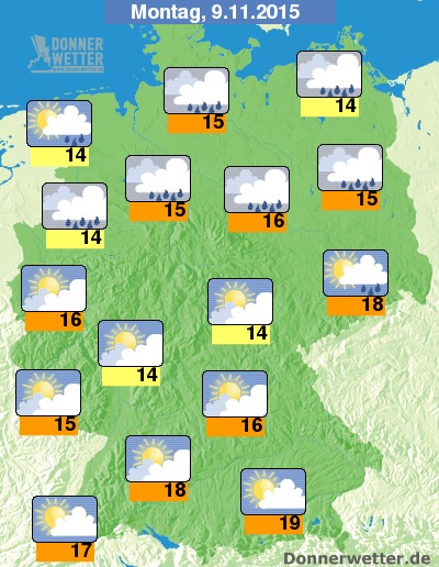 Der Montag bringt der Nordhälfte viele Wolken und immer wieder Regen, freundliches und trockenes Wetter bestimmt dagegen weite Teile der Südhälfte, um 12 bis 18 Grad C.