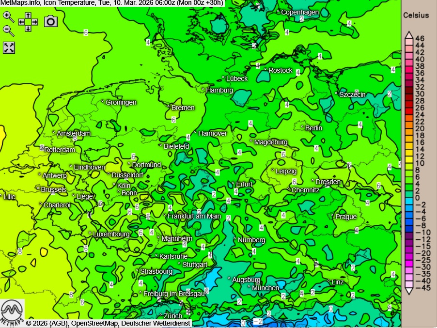 Die Temperaturen erreichen am Nachmittag Höchstwerte um 10 Grad an der Küsten und um 19 Grad im Rhein-Main-Gebiet.