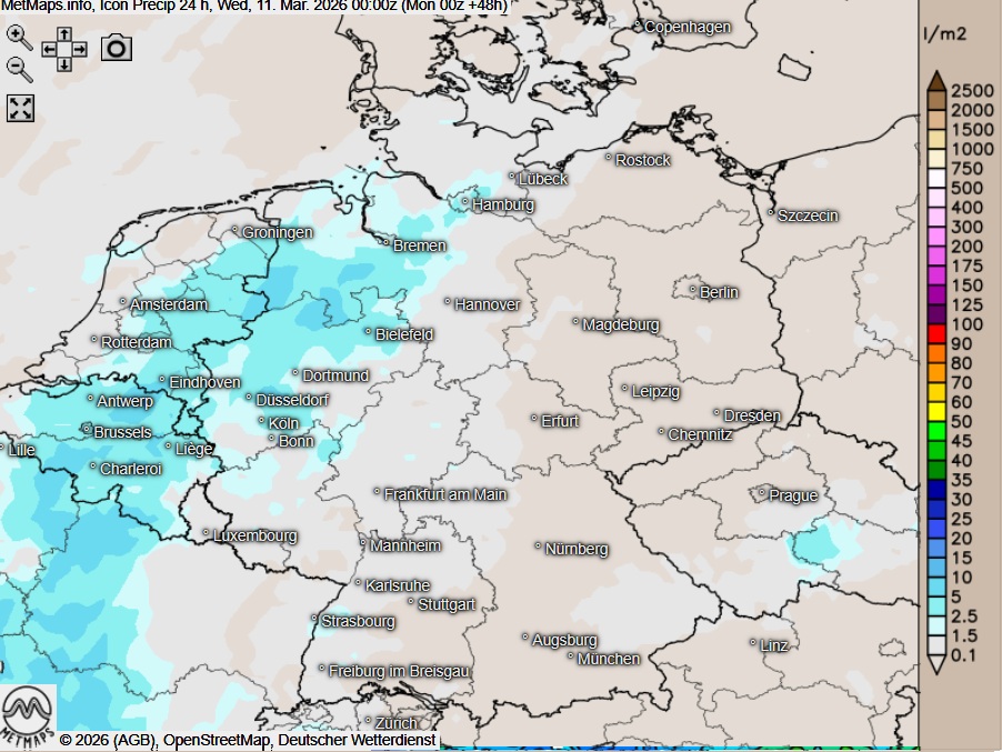 Die Temperatur- und Wetterkarte für Dienstagfrüh (06:00 Uhr) sowie die 24-Stunden-Regenmengen am Dienstag nach ICON: