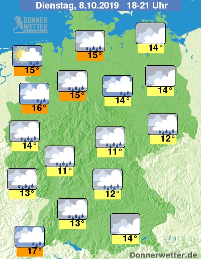 Am Abend fällt aus dichten, grauen Schichtwolken noch häufig Regen oder Sprühregen, gebietsweise auch intensiver. Trocken bleibt es wahrscheinlich noch im Alpenvorland. Wer Glück hat kann im Emsland zwischen den Schauerwolken noch einige goldene Oktobersonnenuntergangsstrahlen erhaschen.