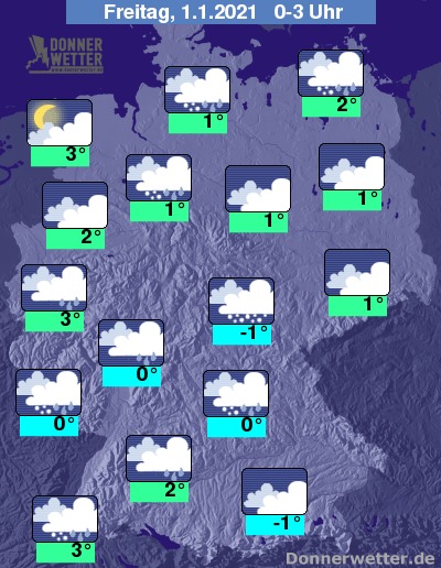 Der Neujahrstag startet vielerorts mit einer geschlossenen Wolkendecke, einzelne Auflockerungen beschränken sich am Morgen auf den Nordwesten des Landes. Verbreitet muss in den Frühstunden mit Schauern gerechnet werden, die auch bis in tiefe Lagen als Schnee fallen können.