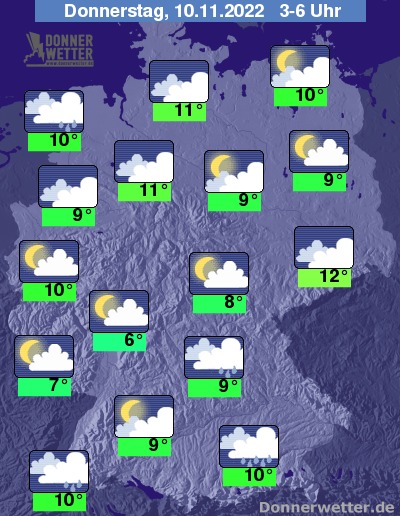 In der bevorstehenden Nacht fällt im Süden unter dichten Wolken verbreitet Regen. Nördlich des Mains ist es zeitweise nur leicht, häufig aber auch stark bewölkt. Lediglich im Nordseeumfeld bilden sich örtliche Schauer, sonst bleibt es weitgehend trocken. Die Temperatur sinkt auf 12 Grad in der Lausitz und etwa 6 Grad am Westerwald.