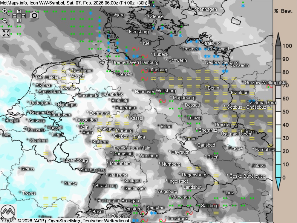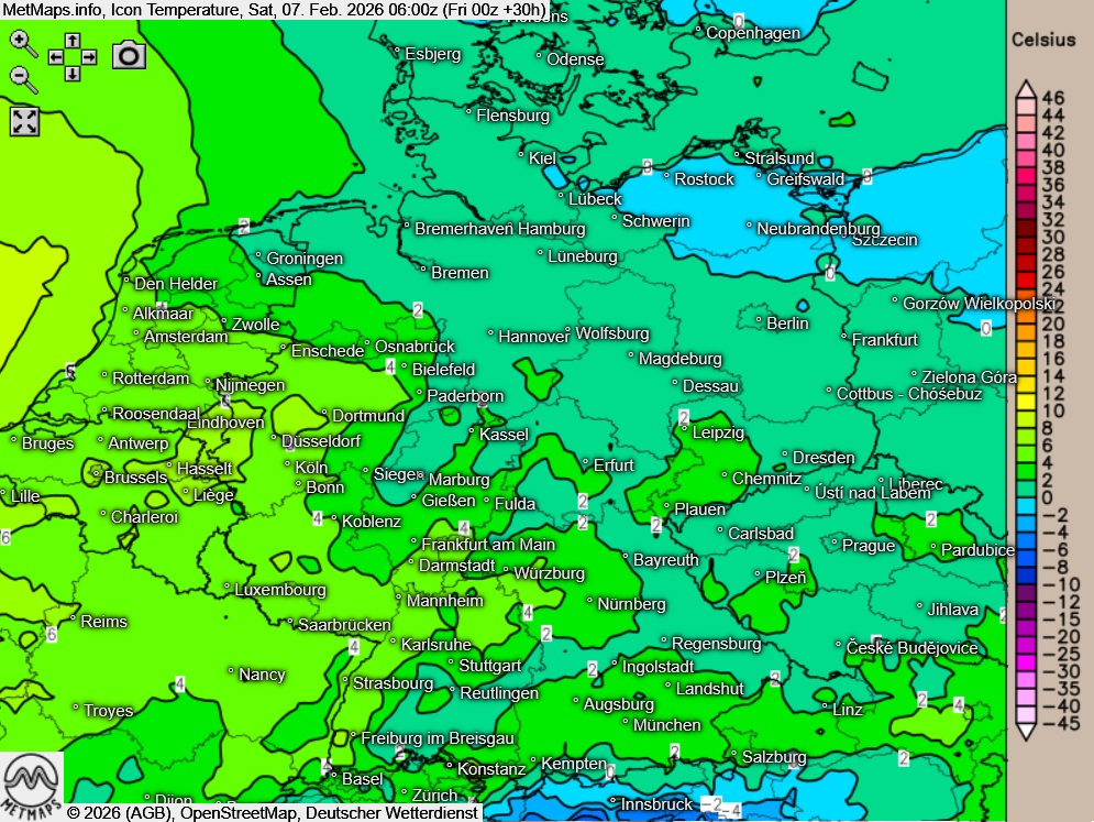 Die Wetter- und Temperaturkarte für Samstagfrüh (05:00 Uhr) nach ICON: