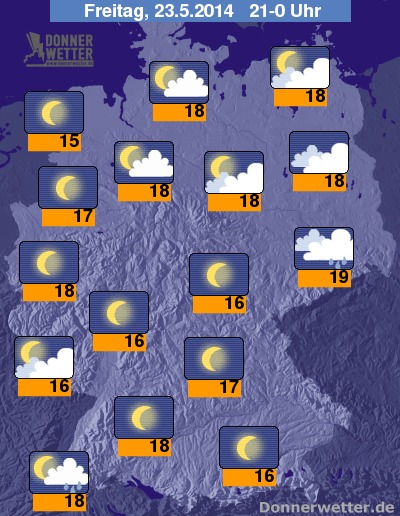 Der Freitag Abend zeigt sich bereits deutlich trockener als der Tag. In weiten Teilen des Landes klart es auf, sonst gibt es nur lockere Bewölkung, In Ostdeutschland sind noch kräftige Schauer und Gewitter möglich, sonst sind sie selten. Die Temperaturen liegen bei Werten um 15 Grad in Nordfriesland und um 19 Grad im Osten.