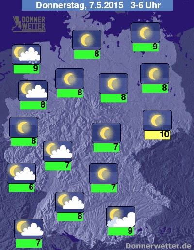 In der kommenden Nacht ist es im Nordwesten, Westen, Südwesten und im äußeren Süden häufig aufgelockert bis stark bewölkt, dazu fällt aber nur selten etwas Regen. Im übrigen Bundesgebiet zeigt sich hingegen ein weitgehend sternenklarer Nachthimmel und es bleibt trocken. Die Temperatur sinkt auf 10 Grad in Niederschlesien und bis 6 Grad am Pfälzer Wald.