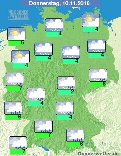 Dazu im Süden mit 7 Grad C in Baden-Württenberg relativ mild, im Norden um 4 Grad C.