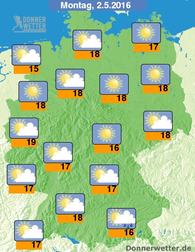 Heute halten sich am Alpenrand meist dichte Wolken, dabei bilden sich zeitweise Schauer. Im übrigen Land scheint hingegen häufig die Sonne und es ziehen nur lockere Wolken durch, in weiten Teilen wird es sogar sonnig, dazu bleibt es trocken. Die Temperatur steigt auf 15 an der ostfriesischen Küste und bis 19 Grad in Düsseldorf.
