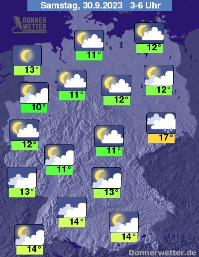 In der Nacht zum Samstag können im Osten und Südosten dichte Wolken noch weitere Schauer bringen, sonst ist es meist locker oder aufgelockert, hier und da auch stark bewölkt, aber trocken. Im Norden ist es vielerorts auch sternenklar. Die Temperatur sinkt auf 17 Grad in Dresden und 10 Grad in Meppen.