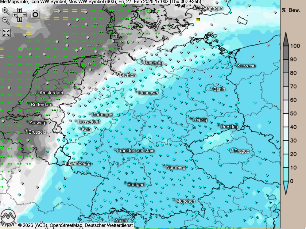 Am Freitagnachmittag zeigt sich der Himmel vom Nordwesten bis an die Ostseeküste stark bewölkt, dabei kann am Nachmittag zeit- und gebietsweise auch etwas Regen fallen. In den übrigen Landesteilen ist es in den nächsten Stunden heiter oder sonnig und es bleibt trocken.