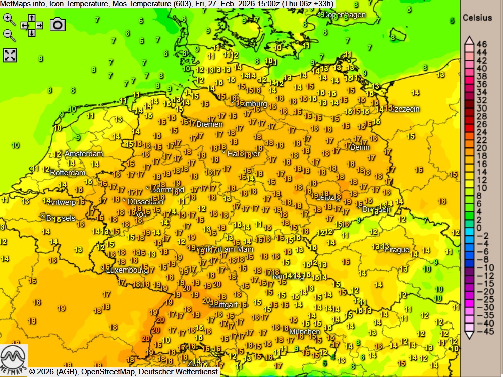 Die Temperaturen erreichen Höchstwerte um 13 Grad im Norden und bis 23 Grad am Kaiserstuhl.