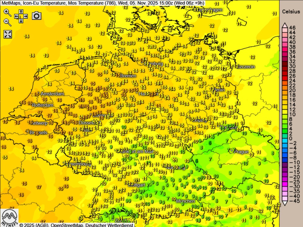Die Lufttemperaturen sowie die Temperaturabweichung am Mittwochnachmittag (15:00 Uhr) nach Icon-Eu: