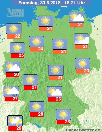 Die Temperaturen bewegen sich in den Abendstunden bei Werten im 21 Grad C  im äußersten Nordosten und um 30 Grad C in Köln.