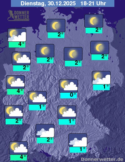 Heute Abend halten sich im Süden noch gebietsweise dichte Wolken und am Alpenrand sind einige Schneeflocken möglich. Im großen Rest des Landes ist der Himmel hingegen verbreitet nur leicht bewölkt und oft sogar sternenklar, dazu bleibt es trocken. Die Temperatur liegt bei 0 Grad im Eichsfeld und teils 4 Grad am Rhein.