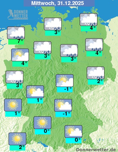 Am Mittwoch scheint vor allem im Süden die Sonne häufig. Dagegen zieht über die Nordhälfte Deutschlands meist starke Bewölkung hinweg, dazwischen können sich auch mal Auflockerungen zeigen. Gebietsweise fällt allerdings Schnee, Schneeregen oder Regen. Die Höchstwerte liegen bei -1 Grad in Mittelfranken und bis 7 Grad an der Nordseeküste.