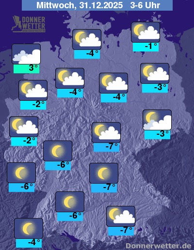 In der Nacht zum Mittwoch können im Norden vorübergehend dichte Wolken mit etwas Schnee aufziehen, oft bleibt es hier aber auch trocken und nur locker bis aufgelockert bewölkt. Vor allem über der Südhälfte ist der Himmel überwiegend sternenklar. Es bleibt dazu trocken bei Tiefstwerten von 3 Grad an der Nordsee und etwa -7 Grad in Oberbayern.
