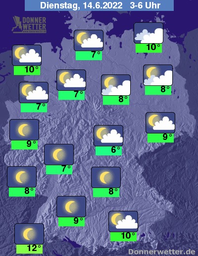 In der kommenden Nacht zeigt sich der Himmel verbreitet nur locker bewölkt oder sternenklar. Im Norden ziehen jedoch oft viele und gebietsweise dichte Wolken durch. Es bleibt überall trocken bei Tiefstwerten von 12 Grad im Breisgau und etwa 6 Grad im Vogtland.