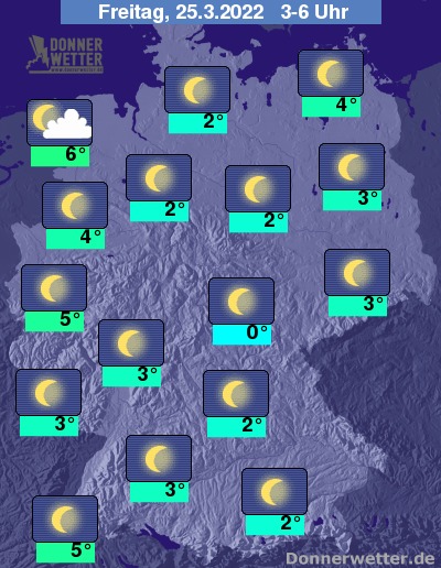 In der Nacht zum Freitag ist der Himmel praktisch bundesweit sternenklar, lediglich an der Nordsee können hier und da ein paar Wolken durchziehen. Es bleibt landesweit trocken bei Tiefstwerten von 6 Grad in Wilhelmshaven und um 0 Grad in Jena.
