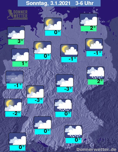 In der kommenden Nacht setzt im Süden und Osten des Landes zeitweise Schneefall, zum Teil auch Schneeregen ein. Etwas Schnee oder Regen ist auch im Nordwesten unter dichten Wolken möglich. Im übrigen Land ist es teils stark, teils auch gering bewölkt und dazu trocken. Stellenweise bildet sich Nebel, dazu sinkt die Temperatur auf 3 Grad an der Nordsee und bis -3 Grad im Thüringer Becken.
