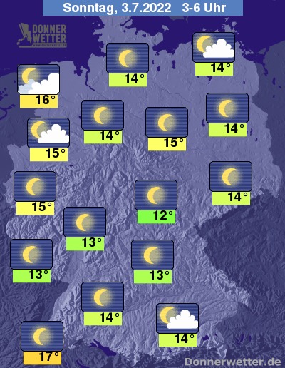 In der Nacht zum Sonntag ist es im Umfeld von Nord- und Ostsee sowie im Südosten der Republik gebietsweise aufgelockert und teils stark bewölkt, dazu bleibt es weitgehend trocken. Im übrigen Land funkeln die Sterne von einem weitgehend wolkenlosen Himmel. Es bleibt landesweit trocken bei Tiefstwerten von 16 Grad in Bremerhaven und 12 Grad in Jena.